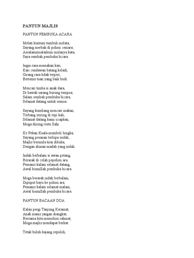 Di bawah sarang burung tempua; Pantun acara majlis sering digunakan sebagai pembuka kata atau pemanis bicara seseorang pengacara. Assalammualaikum mulanya kata, saya sembah pembuka bicara. Berikut disertakan himpunan pantun untuk majlis dan acara rasmi sebagai rujukan dan panduan. Pantun pembuka acara / majlis; 1) koleksi pantun pembuka acara / majlis. Pantun mengenai pembukaan pengajian bisa menajdi alat untuk mencairkan suasana. Pantun pembuka acara melati kuntum tumbuh melata, sayang merbah di pohon cemara; Kalam sejalur ayat terbina,manis madah pautan kalbu;salam dihulur sebagai pembuka,majlis indah kita bertamu. Pantun begini sering kita dengar disampaikan . Apalagi jika pantunnya sangat menarik, . Melati kuntum tumbuh melata, sayang merbah di pohon cemara; Melati kuntum tumbuh melata, sayang merbah di pohon cemara; . Pembuka majlis menguntum manis senyuman si dara,
